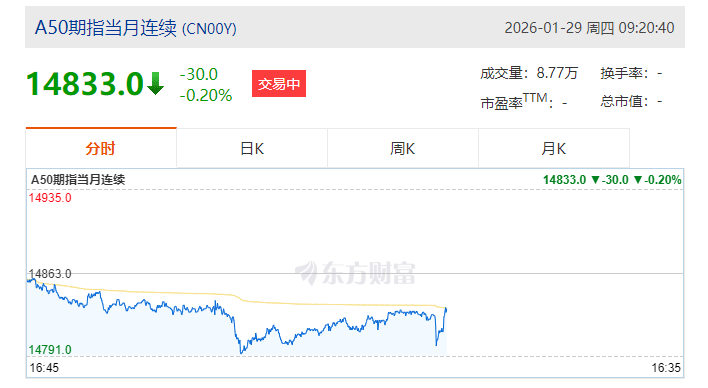 上证报中国证券网讯 1月29日,富时中国A50指数期货在上一个交易日夜盘收跌的基础上低开。截至9时20分,正规配资平台主力合约跌0.2%。